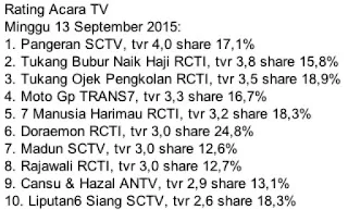 Gambar di atas merupakan daftar 10 besar rating acara TV terbaru pada hari Minggu, 13 September 2015. Terlihat pada gambar di atas kalau sinetron Pangeran SCTV masih berada di nomor 1. Sementara itu rating Rajawali RCTI berada di peringkat 8.